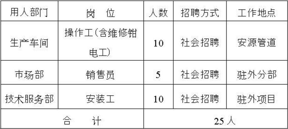 因工作需要,現(xiàn)面向社會(huì)公開招聘安源管道實(shí)業(yè)股份有限公司操作等崗位人員25名,有關(guān)事項(xiàng)公告如下: