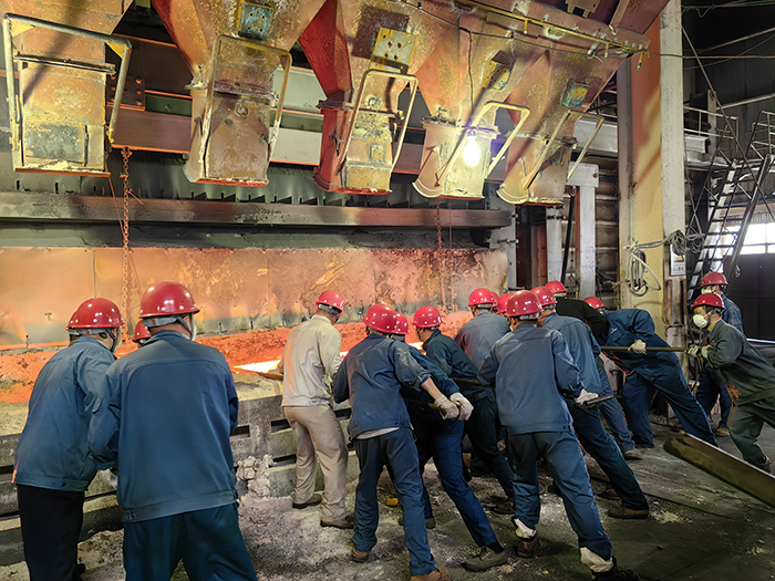 隨著一聲令下,該廠廣大黨員骨干迅速投入到這一攻堅(jiān)戰(zhàn)役中。熔化工關(guān)閉一側(cè)下料口,并停止退出投料機(jī)后,大家迅速清理池壁上沿雜物、結(jié)塊,并及時(shí)調(diào)整投料機(jī)前端高度,鉗工則立即組織加裝焊接推料板。隨后,大家便投入了最為辛苦、最為關(guān)鍵的人工投料環(huán)節(jié)。只見(jiàn)大家10人一組,分工明確,首先打開(kāi)鐵鉤,隨后關(guān)閉下料口,立即通過(guò)提前準(zhǔn)備好的投料車,實(shí)施人工反復(fù)推料。電焊工則在一旁緊張打磨投料機(jī)舌板,現(xiàn)場(chǎng)焊花四濺。盡管爐外溫度高達(dá)100余攝氏度,可是大家的工作熱情、干勁卻絲毫未減,不一會(huì)兒,只見(jiàn)大家個(gè)個(gè)汗流浹背、衣襟濕透,臉上都留下了碩大的汗珠,可是他們顧不上擦拭臉上的汗水,也早已忘記濕透的衣襟,心中想的都是要安全、高效完成攻堅(jiān)任務(wù)。