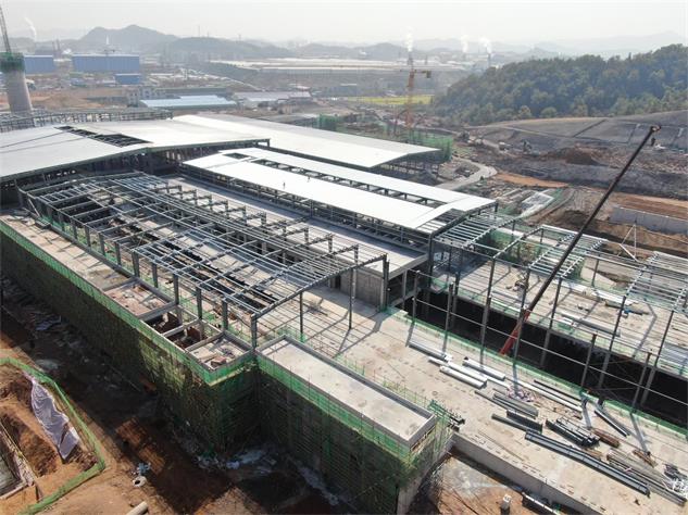 綜合原料庫(kù):基礎(chǔ)工程已完成,鋼結(jié)構(gòu)吊裝完成93%,地坪工程完成 90%。