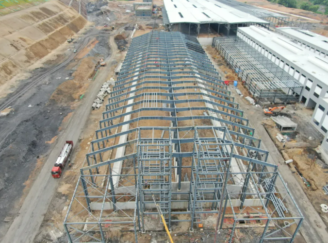 綜合原料庫:基礎(chǔ)工程完成,鋼結(jié)構(gòu)安裝完成98%,墻面板安裝完成98%。