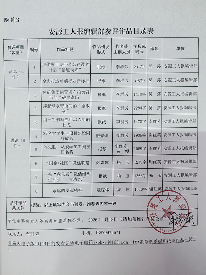 按照《第二十八屆江西報(bào)刊網(wǎng)絡(luò)新聞獎(jiǎng)參評(píng)作品報(bào)送預(yù)通知》要求,安源工人報(bào)編輯部迅速組織推薦參評(píng)作品,經(jīng)編輯記者自薦、評(píng)委會(huì)初評(píng),現(xiàn)將擬推薦參評(píng)的10件作品(見(jiàn)附件)進(jìn)行公示。公示時(shí)間:2026年1月14日—1月16日,如有意見(jiàn)可向安源工人報(bào)編輯部反映。聯(lián)系電話:0799-6582416。 安源工人報(bào)編輯部 2026年1月14日 附件:參評(píng)作品目錄表