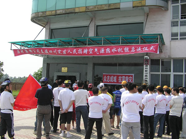 汶川地震發(fā)生后,四川綿陽市安置了大量災(zāi)民。5月13日,溫家寶總理來到綿陽九州體育館地震災(zāi)區(qū)安置點(diǎn)看望災(zāi)民。5月18日,安源熱能在四川綿陽的經(jīng)銷商來電告之:災(zāi)民安置點(diǎn)缺少熱水,災(zāi)民自地震發(fā)生后就沒用熱水洗過臉、搓過澡,一些傷員傷口感染。經(jīng)銷商表示想給災(zāi)民安置點(diǎn)捐一臺(tái)5噸左右的熱能機(jī)組。得知這一情況后,安源熱能公司的同志很想自己為災(zāi)區(qū)捐獻(xiàn)熱能機(jī)組。這一想法很快得到上級(jí)領(lǐng)導(dǎo)的贊同,集團(tuán)公司決定:給四川綿陽災(zāi)區(qū)安置點(diǎn)捐獻(xiàn)2臺(tái)價(jià)值30萬元的RS-89型20噸熱能熱水機(jī)組。經(jīng)過與四川綿陽市紅十字會(huì)聯(lián)系后,立即得到答復(fù):非常歡迎并希望盡快到貨,兩臺(tái)機(jī)組分別安置到九州體育館和南沙體育中心兩個(gè)災(zāi)民安置點(diǎn)。