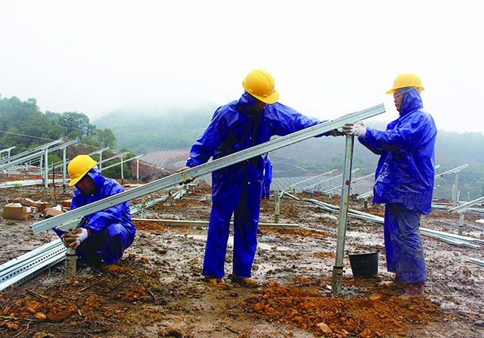 “坡度不夠,前立柱再抬高5公分,再高點(diǎn)……”日前,記者來到集團(tuán)公司光伏發(fā)電項(xiàng)目山頂施工現(xiàn)場,只見工人們以三人為一小組,正冒雨校對支架坡度。放眼遠(yuǎn)眺,山腳平地間,有的工人正在攪拌水泥砂漿,有的正往山頂背送檁條……施工現(xiàn)場一片繁忙。 該項(xiàng)目是集團(tuán)公司轉(zhuǎn)型發(fā)展的重點(diǎn)項(xiàng)目,規(guī)劃占地總面積為560畝,投資1.67億元,規(guī)劃容量為20兆瓦,共安裝270瓦太陽能光伏組件74660塊,年均上網(wǎng)發(fā)電量為1855.32萬度,并經(jīng)35KV升壓站接入國網(wǎng)萍鄉(xiāng)電網(wǎng)。 “要想能源采集效率最大化,先要確認(rèn)支架坡度的準(zhǔn)確性,且確保太陽能板與地面距離不低于300mm,并保證每組太陽能板處于同一水平線上!表(xiàng)目相關(guān)負(fù)責(zé)人告訴記者,目前已完成基礎(chǔ)澆筑等工作,正在蹄疾步穩(wěn)地安裝檁條及鋪設(shè)太陽能板。此外綜合樓內(nèi)部裝修、電纜敷設(shè)連接及外圍線路建設(shè)等電氣施工也正在同步進(jìn)行,預(yù)計(jì)11月底可基本完工。 “今天將近200名工人做事,從6點(diǎn)30準(zhǔn)時開工,可能晚上要加班到10點(diǎn)——你看,四周都裝有照明燈,夜間能夠照亮整個施工現(xiàn)場。”項(xiàng)目相關(guān)負(fù)責(zé)人表示,為了確保工程如期竣工,力爭12月實(shí)現(xiàn)并網(wǎng)發(fā)電,在保障工人們安全的前提下,除了風(fēng)雨兼程保施工之外,還得挑燈夜戰(zhàn)趕進(jìn)度,爭分奪秒搶工期。 時間緊,工序雜,任務(wù)重。為此,集團(tuán)公司還專門成立了項(xiàng)目領(lǐng)導(dǎo)小組,開展轉(zhuǎn)型落地項(xiàng)目重點(diǎn)攻關(guān);制定了管理人員駐點(diǎn)督導(dǎo)制,項(xiàng)目相關(guān)負(fù)責(zé)人每天蹲守現(xiàn)場進(jìn)行監(jiān)管、協(xié)調(diào),積極落實(shí)主體責(zé)任;完善了考核倒逼機(jī)制,不僅倒排工期制定工程進(jìn)度時間表,相關(guān)負(fù)責(zé)人還繳納項(xiàng)目保證金和簽訂責(zé)任狀,并對照項(xiàng)目工期完成進(jìn)度嚴(yán)格考核。