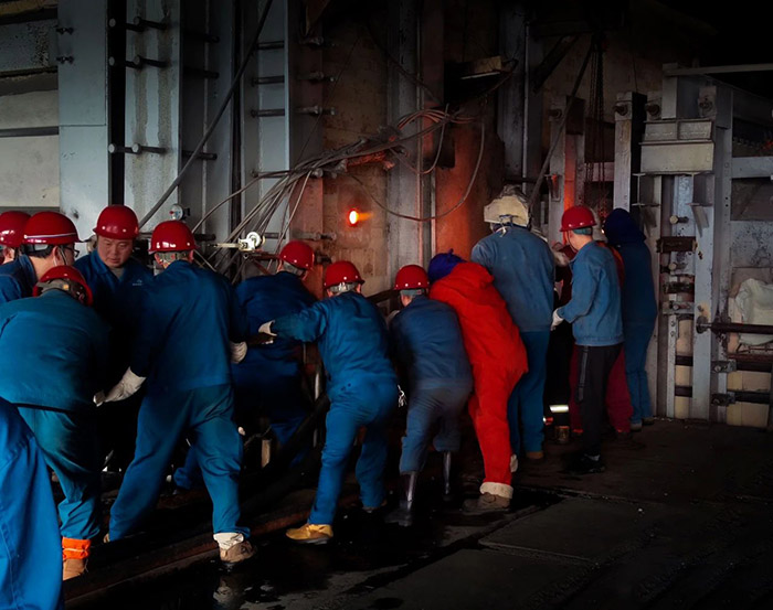 上午8點半,在熔窯卡脖部位,一股股的熱氣不斷從拆掉擋火板后的爐門中噴涌而出,溫度超100℃。在熔爐南北兩邊,參與“戰(zhàn)斗”人員按照各自分工迅速就位:一部分人將提前制作的水包運至熔化工段;另一部分人檢查卡脖吊掛設施。接著,穿著厚厚保溫棉衣的保窯工和鉗工一起,拆卸深層水包的固定裝置。爐內通紅的烈焰是熔化的玻璃液,即使離了10多米遠,都能感到它的熱度,多待一會臉上如針扎般疼痛。