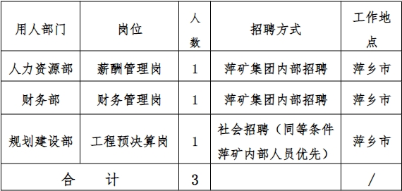 因工作需要,萍礦集團(tuán)公司招聘薪酬管理崗、財(cái)務(wù)管理崗、工程預(yù)決算崗各1人,現(xiàn)將有關(guān)事項(xiàng)公告如下: