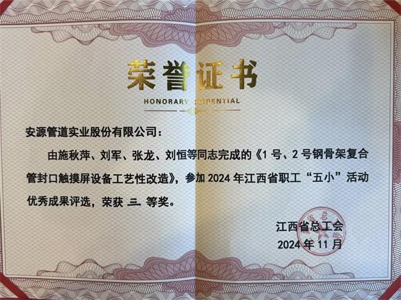 11月28日,在贛州召開(kāi)的2024年江西省職工“五小”活動(dòng)優(yōu)秀成果發(fā)布會(huì)上,安源管道公司“1號(hào)、2號(hào)鋼骨架封口觸摸屏設(shè)備工藝性改造項(xiàng)目”榮獲三等獎(jiǎng)。