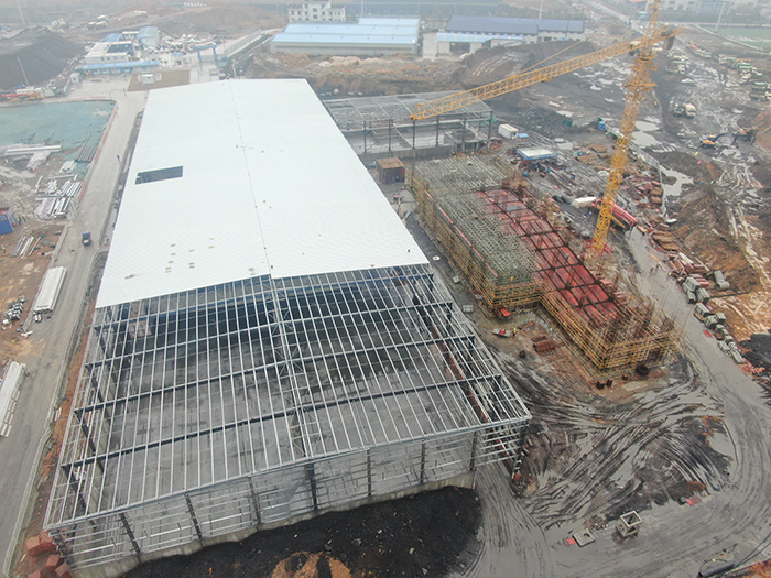 綜合原料庫:基礎(chǔ)工程完成,鋼結(jié)構(gòu)吊裝完成90%,地坪工程完成90%。 原料車間:基礎(chǔ)工程完成,主體工程完成16%。