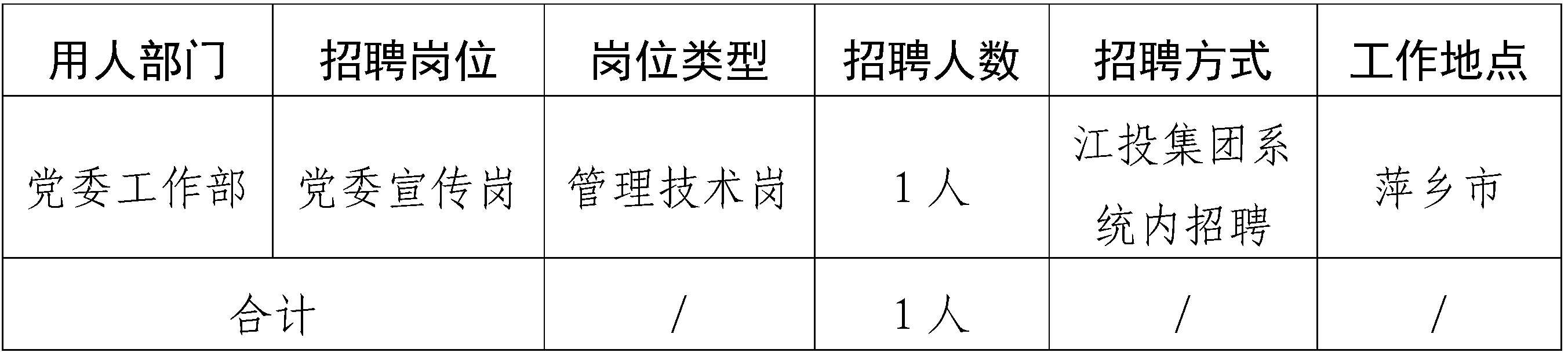 因萍礦集團(tuán)公司本部黨委宣傳工作需要,現(xiàn)面向江投集團(tuán)系統(tǒng)內(nèi)部公開(kāi)招聘黨委宣傳崗1人。有關(guān)招聘事項(xiàng)公告如下: