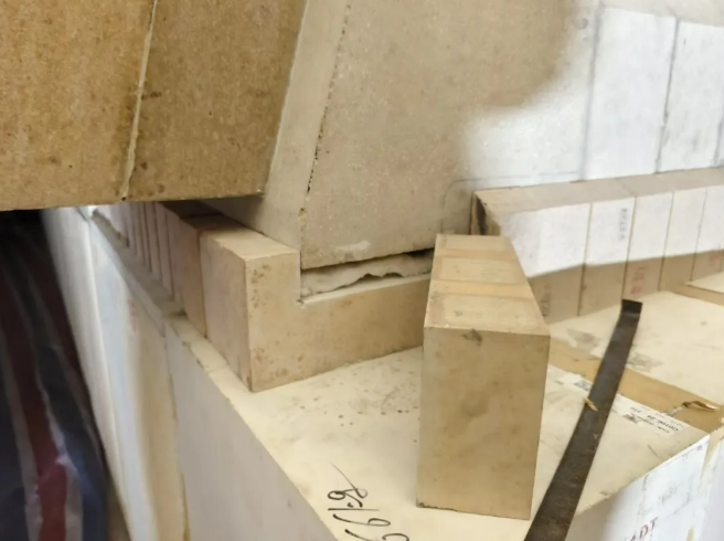別看這只是一塊小小的楔形磚,卻構(gòu)建起“掛鉤磚—楔形磚—7字磚—池壁磚”四層協(xié)同防護(hù)體系。即便7字磚頭部發(fā)生燒損,楔形磚依然能獨(dú)立阻擋爐火,避免托板鐵直接受沖刷,從根本上限制了7字磚的位移和脫落風(fēng)險(xiǎn)。這一動(dòng)態(tài)密封安裝工藝,既解決了預(yù)留間隙過(guò)大無(wú)法密封的問(wèn)題,又避免了熱膨脹導(dǎo)致的磚體擠壓斷裂,實(shí)現(xiàn)“小改動(dòng)解決大問(wèn)題”。