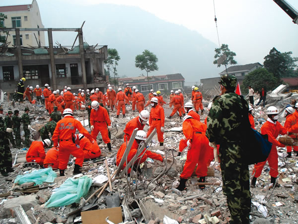 消防官兵在北川中學(xué)的廢墟上全力搜救
