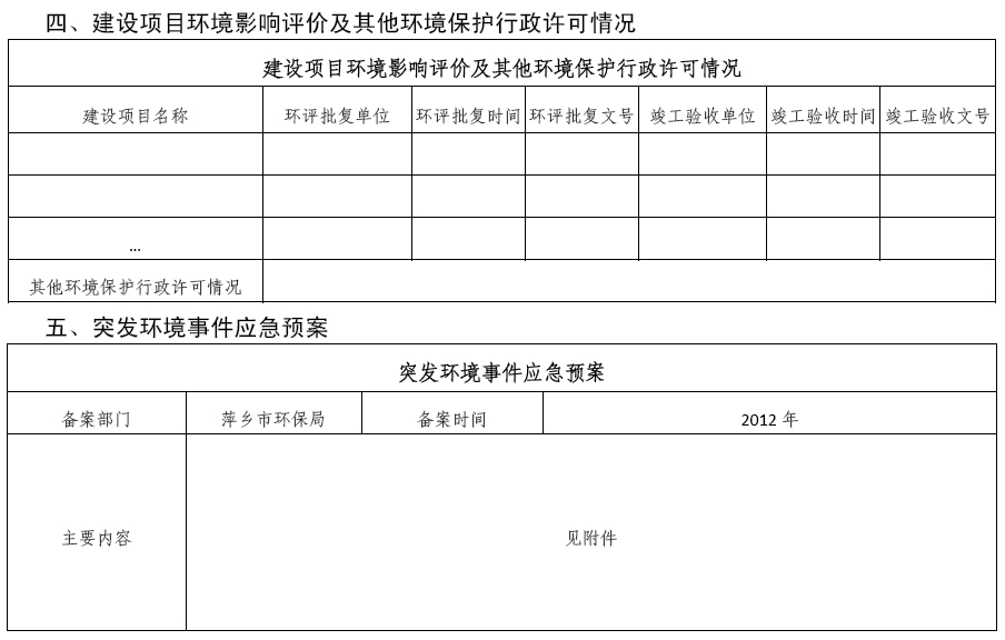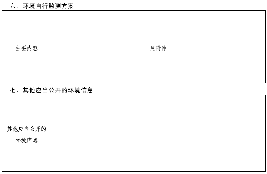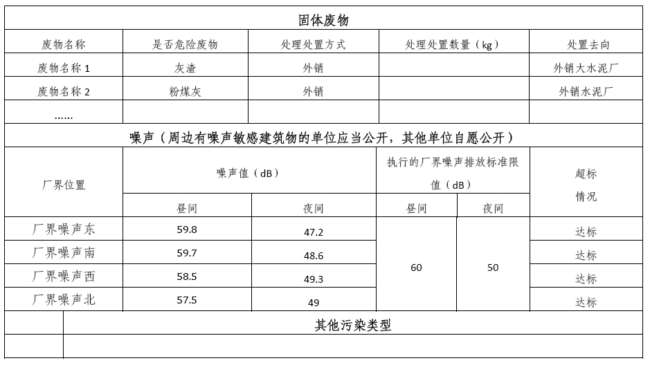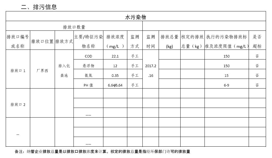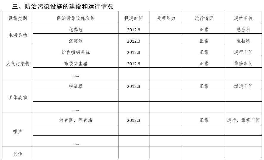 填表說明: 1、排放口編號或名稱應(yīng)與排污許可證上載明的一致,排放口位置為排放口所在的經(jīng)緯度,排放方式為納管或排環(huán)境,排放濃度為最近一次監(jiān)測數(shù)值,監(jiān)測方式為手工或自動,排放總量為最近一次的年度實際排放總量,核定的排放總量為排污許可證上載明的核定排放總量或環(huán)評批復(fù)上允許的排放總量。 2、污染源自動監(jiān)控系統(tǒng)作為環(huán)境保護(hù)設(shè)施的組成部分,應(yīng)在防治污染設(shè)施的建設(shè)和運(yùn)行情況中予以公開,并在處理能力中填寫監(jiān)測指標(biāo)。 3、企業(yè)事業(yè)單位環(huán)境信息涉及國家秘密、商業(yè)秘密或者個人隱私的,依法可以不公開,法律、法規(guī)另有規(guī)定的,從其規(guī)定。