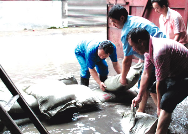 電焊條廠職工正在焊條生產(chǎn)車間用沙袋圍堵洪水。記者 袁鵬 攝