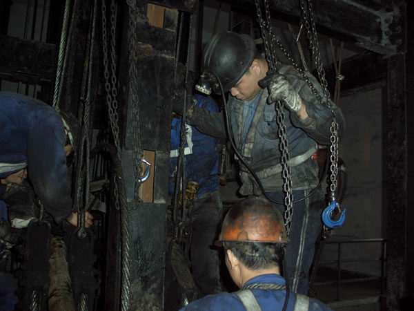 巨源煤業(yè)公司立井摩擦輪絞車主提升鋼絲繩是礦井生產(chǎn)中的重要運輸工具,為四根6×25Fi型鋼絲繩,每根長度為300米,按《煤礦安全規(guī)程》規(guī)定已接近服務(wù)最大年限。為確保提升系統(tǒng)安全,保證礦井的正常生產(chǎn),近日,機電科挑選精兵強將對該鋼絲繩進行更換。經(jīng)過兩天的奮戰(zhàn),他們將四根新提升鋼絲繩成功安裝到立井提升系統(tǒng),更換工作提前保質(zhì)保量順利完成。圖為技術(shù)人員正在立井緊張施工。
